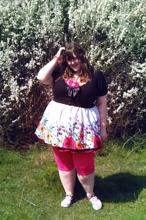 I wore one of my new Joe Browns dresses, they arrived last week. One had to be sent back, the duck egg blue beach dress, as the fit was really poor, much too big around the back and hung down below my bra strap. The other 2 are really cute though, this being one of them. The fit for this one is a bit on the generous size, under the bust is rather large, but this may suit some with a bigger middle than me. I wore the cropped cardy to pull it closer to my body. The bust area is also very generous, but not loose on me. You could probably go down a size or 2 if you have an average or smaller than average chest. The pattern is really pretty, very summery. It is a very short dress though, so I wore it with leggings & a petticoat underneath for extra coverage. It's nice & light too, it's not lined, so it is slightly see through, but not noticeably.