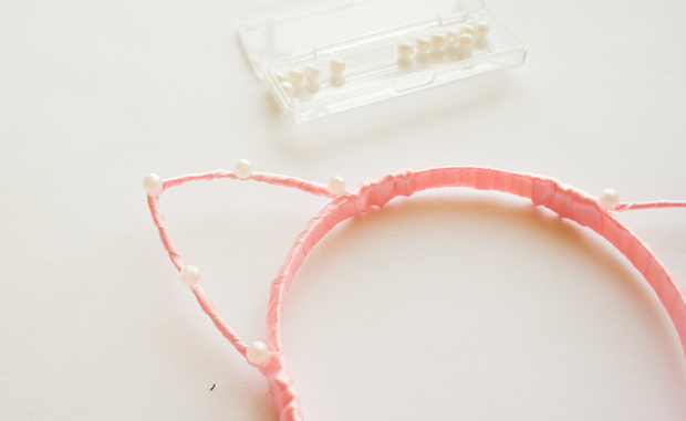 Step 10 - The fun part! Glue your decorations onto the ear sections. I used 18 pearls & spaced them out along the wire, but you could completely cover them if you wanted. Or alternate diamantes and pearls, etc etc!