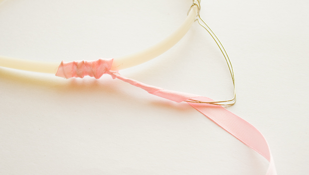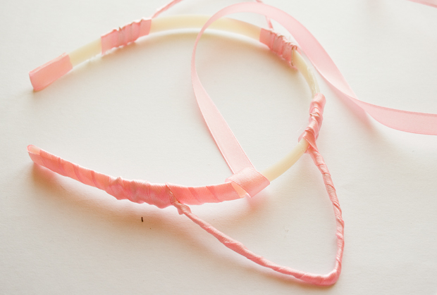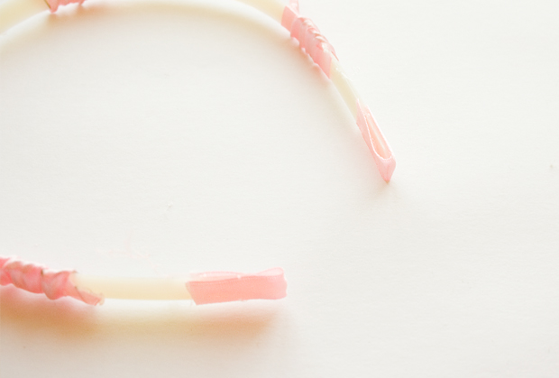 Step 9 - Now gather a long bit of ribbon, around a metre, & glue to the end of your headband. Then start wrapping, covering the entire headband base. Glue the ribbon down as you go.