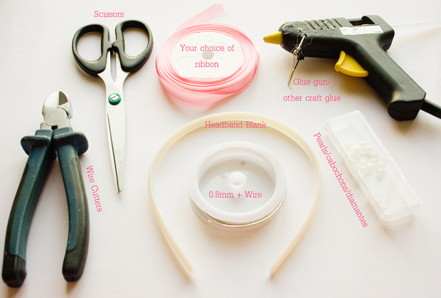 Step One - Gather all your supplies, as pictured above. I would recommend the ribbon to be about 10mm wide, but it's really up to you. I used basic satin ribbon, but you can use pretty much any type. The decorations can also be pretty much anything, not just pearls, but diamantes, flower cabochons, tiny buttons, funky beads, anything you like.